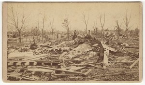 At 8:55pm, the tornado ripped through residential neighborhoods west and north of downtown. The effect was catastrophic. 48 city blocks were virtually obliterated. Entire subdivisions, including large brick homes, simply disintegrated. The Willis Heights neighborhood suffered the worst. Over 100 people died in that section alone. Whole families were wiped out. Fire swept the ruins following the tornado and the city’s water system was crippled, leaving firefighters helpless to stop the flames. Many survivors trapped in the ruins died in the blaze. In a miracle of mercy, however, a torrential rain fell not long after the tornado and eventually extinguished the flames. The city’s hospital was destroyed, so victims had to be taken to nearby towns. Many of them didn’t make it. In all, 1100 homes, ten churches and four schools were destroyed. Papers and other lightweight debris from Tupelo was found 140 miles away near Flintville, Tennessee.
