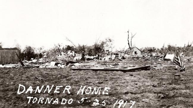 The tornado moving through farmland north of town. This is the earliest known photograph of an F5 tornado.