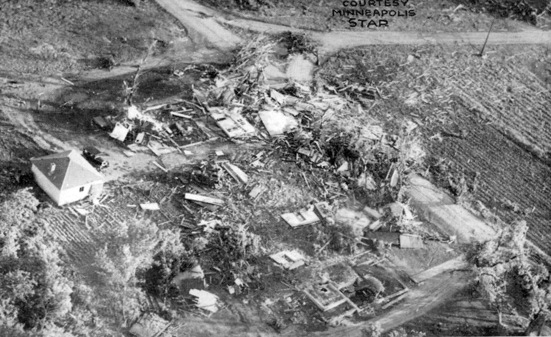 Overshadowed by the devastating outbreak that hit the mid-Atlantic states just a few days later, this powerful tornado touched down shortly after 5 pm on June 17, 1944 five miles south of Summit, South Dakota and moved northeast. The tornado intensified rapidly as it ripped through farmland south of Wilmot. Fifteen farms south and southwest of Wilmot were destroyed and some were completely swept away. A few farms vanished entirely, with the debris not even able to be located on the surrounding prairie. The tornado was up to a mile wide in this area. After passing east of Wilmot, it continued northeast at somewhat diminished intensity, crossing Big Stone Lake into Minnesota near Hiawatha Beach and lifting three miles east of Beardsley. Eight people were killed and many more were injured. The tornado was highly visible in Minnesota, though much narrower, with numerous rural residents watching the funnel snake across the countryside. Shortly after the funnel lifted, the parent thunderstorm collapsed, causing widespread severe wind damage in Big Stone County.