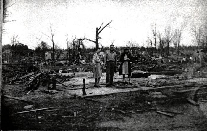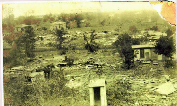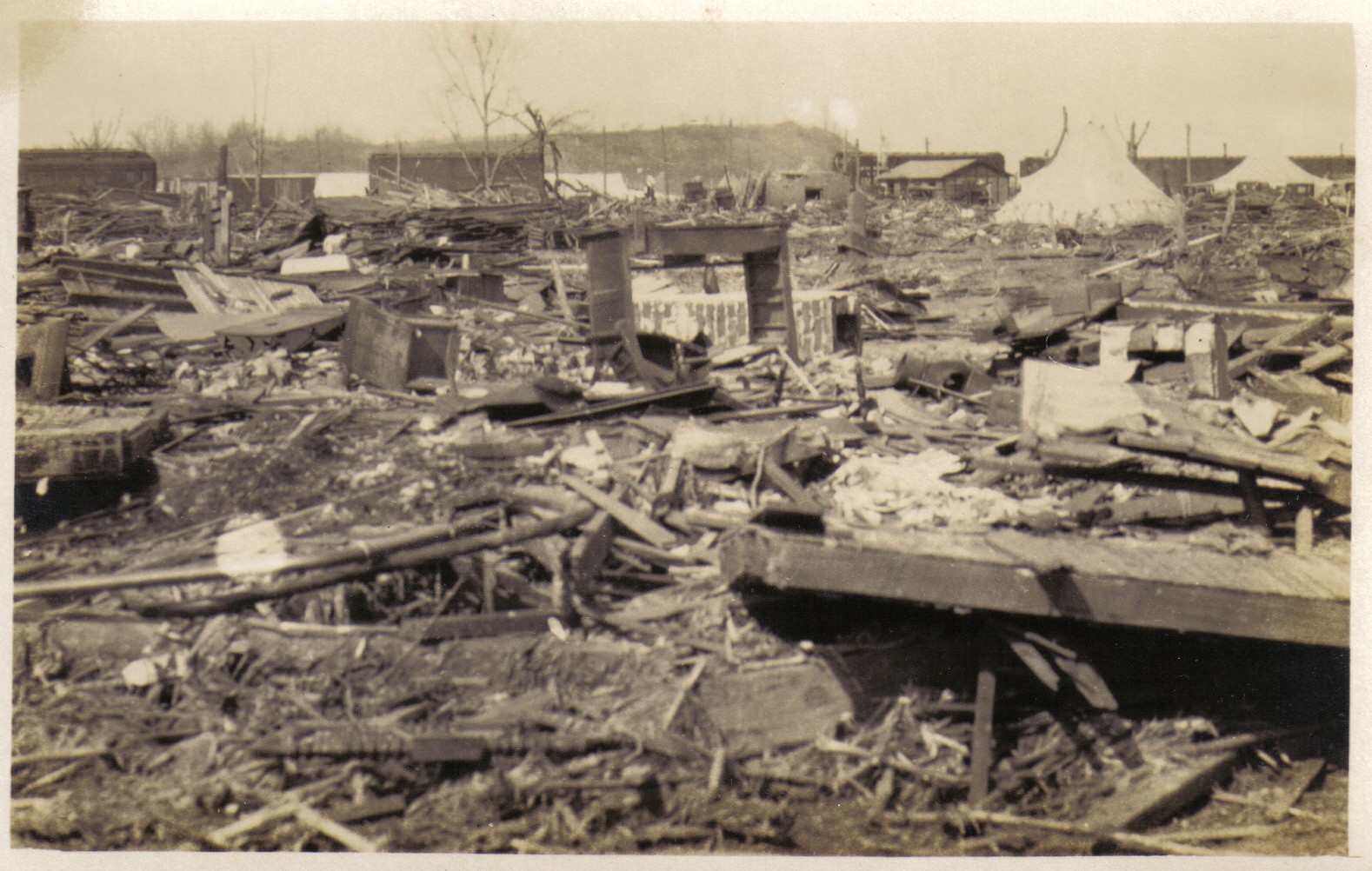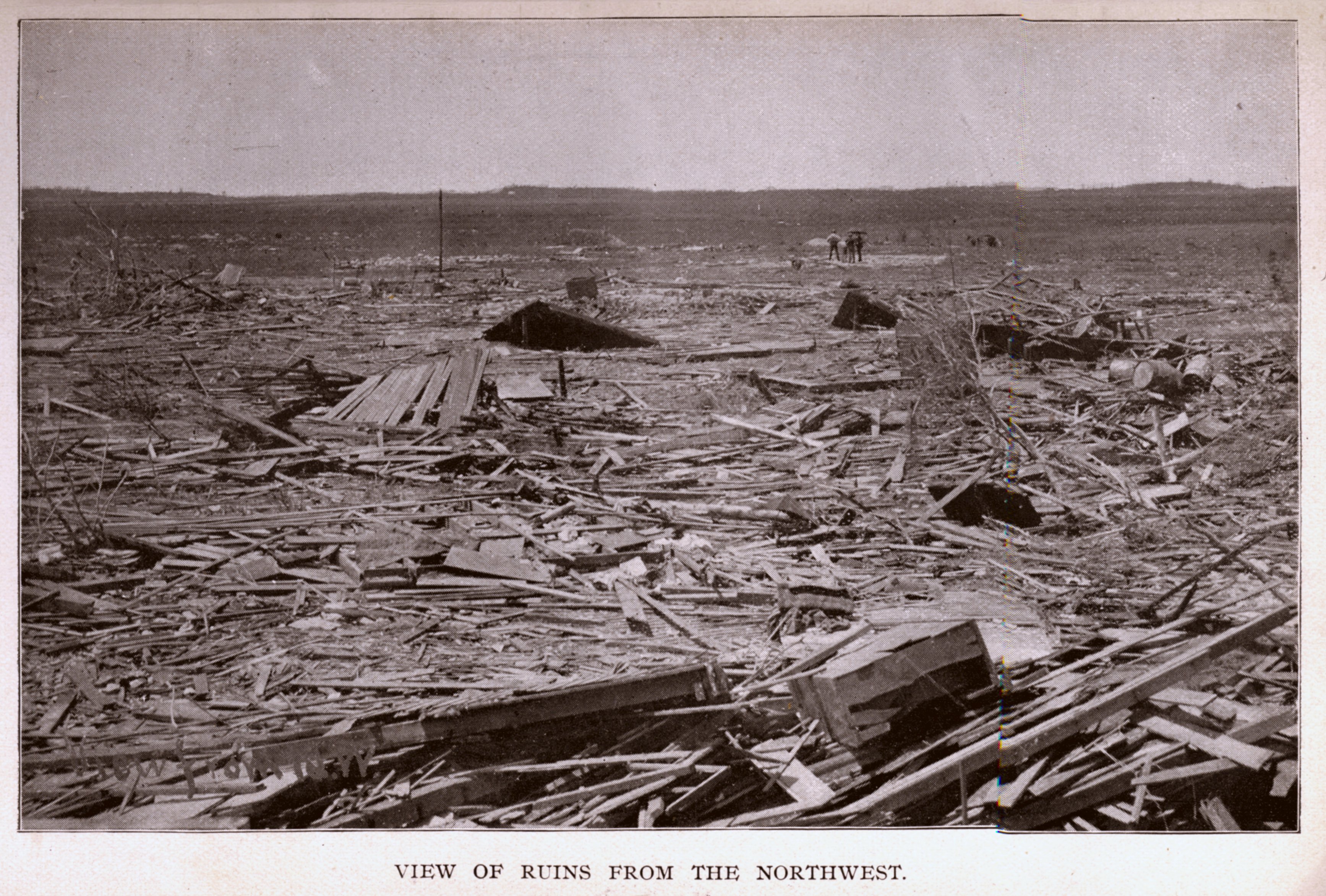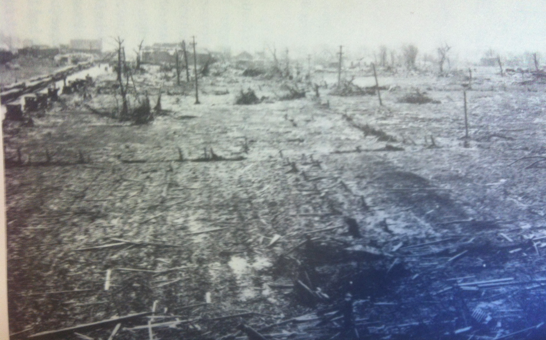 In the foreground is all that remained of the First Baptist Church, obliterated by the tornado. In the background is the wrecked courthouse. Its beautiful Greco-Roman architecture was never restored.