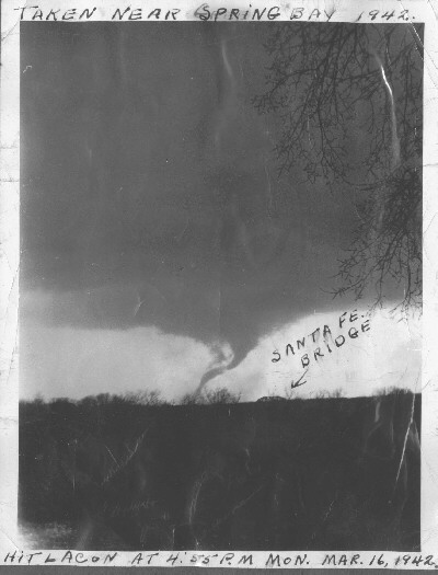 Just three months after Pearl Harbor, this tornado devastated the quiet Illinois River town of Lacon, the seat of Marshall County. Part of a major early-season outbreak that saw devastating tornadoes also hit the towns of Water Valley, Mississippi; Bethel Springs, Tennessee; and Goshen, Indiana; the Lacon tornado touched down northwest of Peoria near Kickapoo and moved north-northeast, following the Illinois River. It first struck the northwest side of Chillicothe on the west bank, apparently with relatively minor damage. The tornado traveled along the west bank of the river for about two miles, passing just east of Hopewell. Two people were killed nearby. However, the tornado really intensified as it moved over the river northeast of Hopewell, churning up mud and water as it went.
