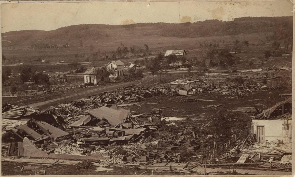 It was a typical Saturday evening in Grinnell. Most people had turned in for the night. By about 8pm, a terrific storm of heavy rain and brilliant lightning descended on the town. It drowned out the roar of the monster coming in from the northwest. At 8:30, the tornado tore right through the heart of Grinnell with devastating effect. Half the city was destroyed and dozens of people were killed. Grinnell College was left in ruins. All that was left of the sprawling main building, made of brick, was its outer walls. Its main tower collapsed and took out a giant center section. Its bell was thrown into an adjacent field. Three students died in the wrecked dormitories. Just east of town, a train engine and 14 freight cars were thrown from the tracks, killing two people. In all, 39 people died in Grinnell alone and 73 homes were destroyed. Flooding rains inundated the town before, during, and after the tornado, leaving the ruins awash in up to a foot of water, hampering rescue efforts.