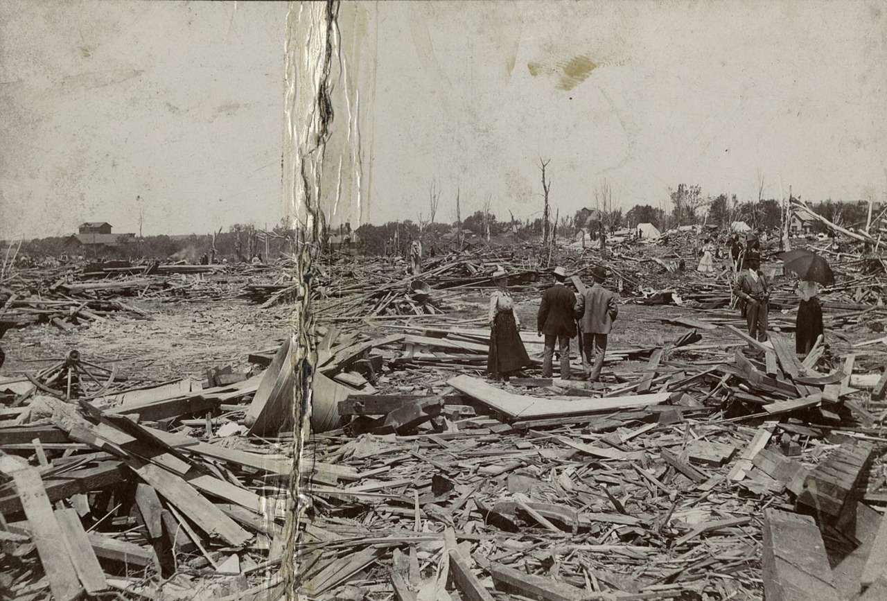 The small community of Oakville, Indiana was virtually wiped out of existence by this large and powerful tornado. It formed about three miles northeast of Mechanicsburg, moving erratically northeastward, eventually curving more to the east. It ripped through Oakville at around 5pm as a half mile wide F5 and the town was obliterated. Out of 45 houses, just five remained standing. Entire sections of town simply vanished. Debris from Oakville was scattered for miles over open farmland to the east. The remains of one disintegrated home were found two and a half miles away. Heavy oak sills were carried half a mile and pieces of homes as far as three miles. The town’s large saw mill and an adjacent warehouse were destroyed. Just five people were killed in Oakville. Two of the victims were carried half a mile into a wooded area. However, given the totality of the devastation, it’s somewhat miraculous the death toll was that low. Survivors reported that the tornado was spectacularly visible, backlit by an eerie green glow, and most of the townspeople were able to seek shelter. It continued to cause heavy damage over rural areas east of Oakville, passing north of Luray and through the Mount Pleasant area before probably lifting a short distance east of what is now Prairie Creek Reservoir. This was one of the first major tornadoes where the famous green glow was reported.