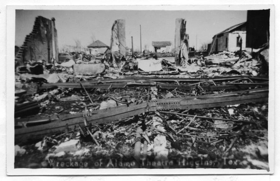 This was all that remained of the Alamo Theatre in Higgins, which was built of brick and reinforced with steel girders, which you see in the foreground.