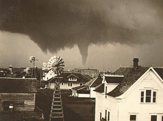 The tornado moving through farmland north of town. This is believed to be the first photograph of an F5 tornado.