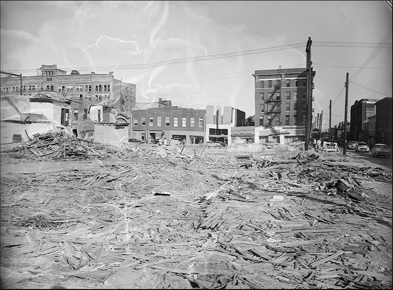 This is the site of the five story office building that collapsed at the intersection of Austin Ave and 5th St. 61 people died when this entire block was wiped out. This picture was taken after extensive cleanup had already taken place and most of the debris had been removed.