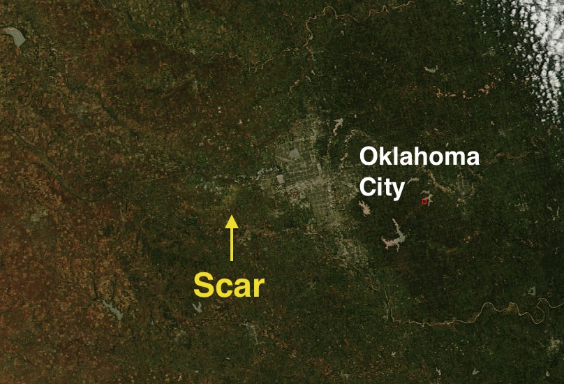 A satellite image of the incredible devastation. In the section between Grand and Iowa Avenues in the upper right of the picture near the athletic fields, multiple swept away homes can be seen.