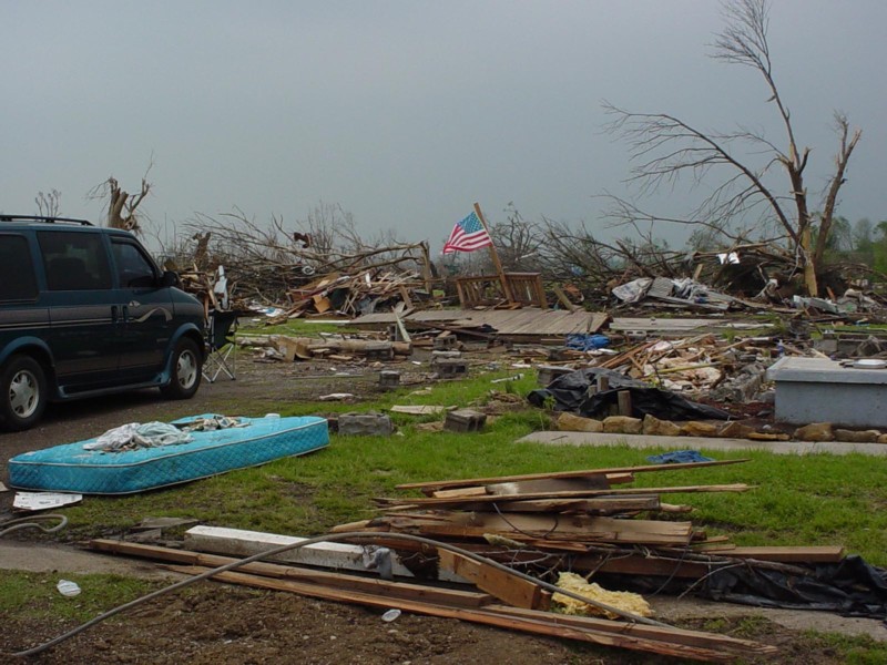 A destroyed house in Greensburg. The brick home behind it has also been severely damaged.