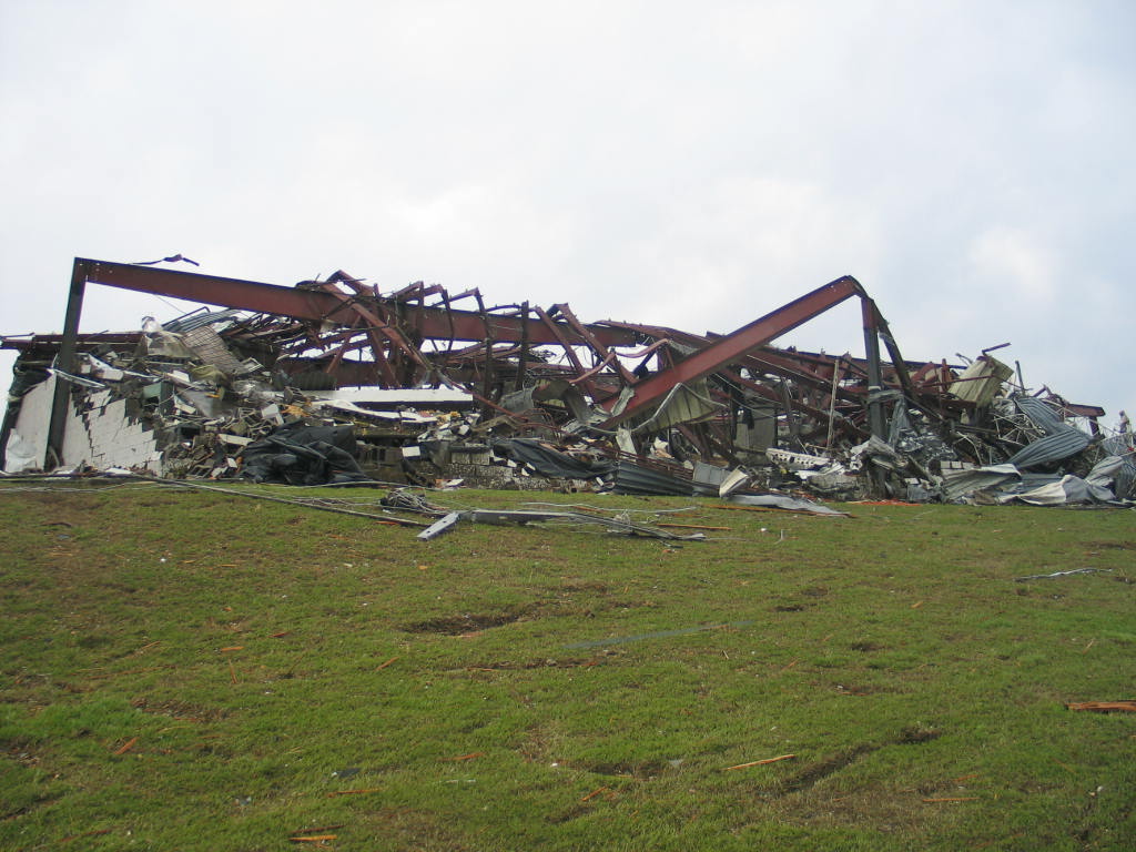This warehouse was completely leveled and steel beams were twisted or snapped off at the base.