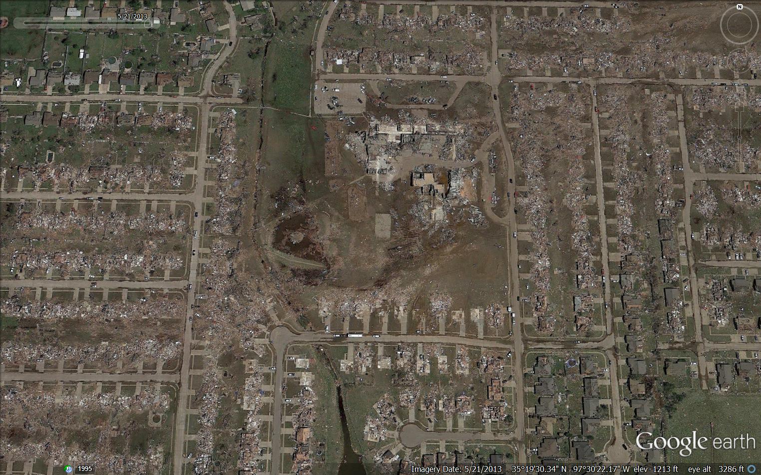 Plaza Towers Elementary after the tornado. Note the entire row of swept away homes behind it. A wider view from Google Earth can be seen here.