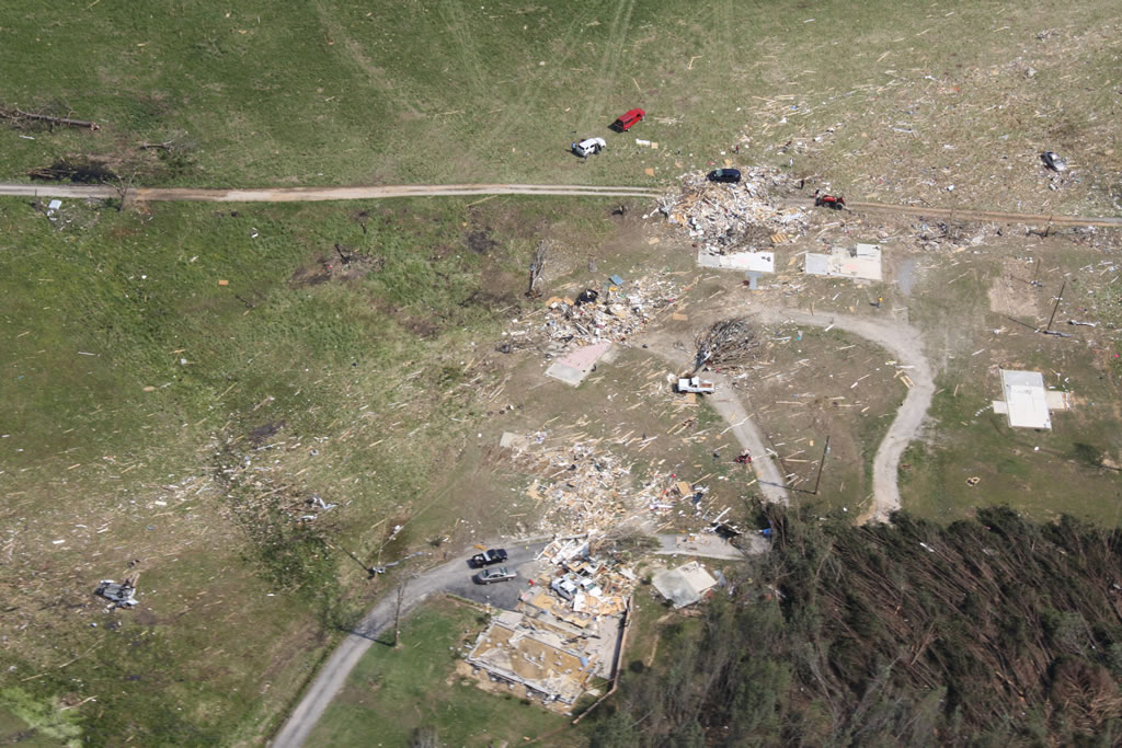 The appalling aftermath of the tornado in the Parkwood Meadows subdivision on the northeast side of Vilonia. Aspen Creek Drive, on the left, was wiped out of existence. These homes were large but supposedly anchored with nails instead of bolts, leading the NWS to conservatively rate this damage EF4.
