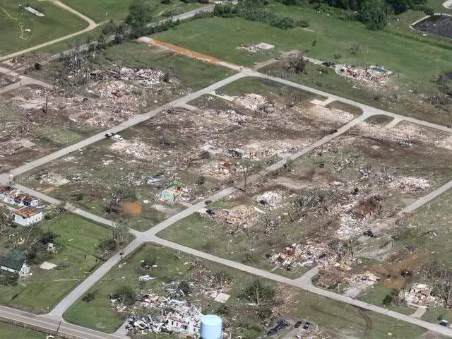An aerial view of some of the incredible devastation in Spencer. Some of the homes in this picture have been swept away.