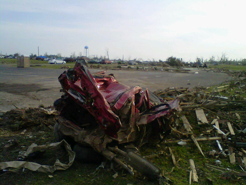 This SUV was thrown half a mile into the water tower in the background, bouncing off and landing here.