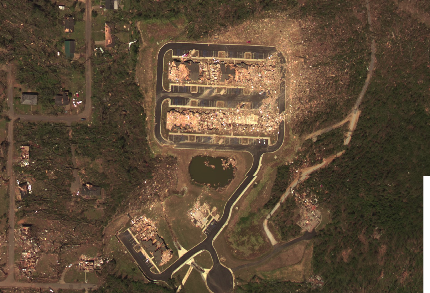 Aerial view of the extreme damage at the Chastain Manor Apartments. The southeast portion of the complex as well as the clubhouse at the bottom center of the picture have been almost entirely swept away.