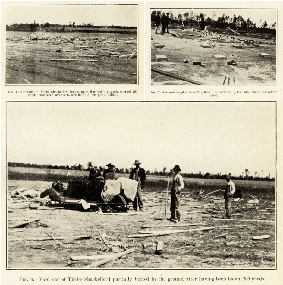 Credit: Monthly Weather ReviewBlevins, Arkansas – April 15, 1921 – This tornado wiped out several small communities across rural southwestern Arkansas. Blevins in Hempstead County was hardest hit. Homes were swept away and a vehicle was thrown 200 yards and partially buried in soil. At one leveled home, the concrete fireplace was shifted three feet. 34 people were killed in Hempstead County alone. Nine people died in Texas, though this was probably a series of tornadoes produced by the same supercell, rather than just a single tornado. NCDC lists this event as F5, but Grazulis lists it as F4.