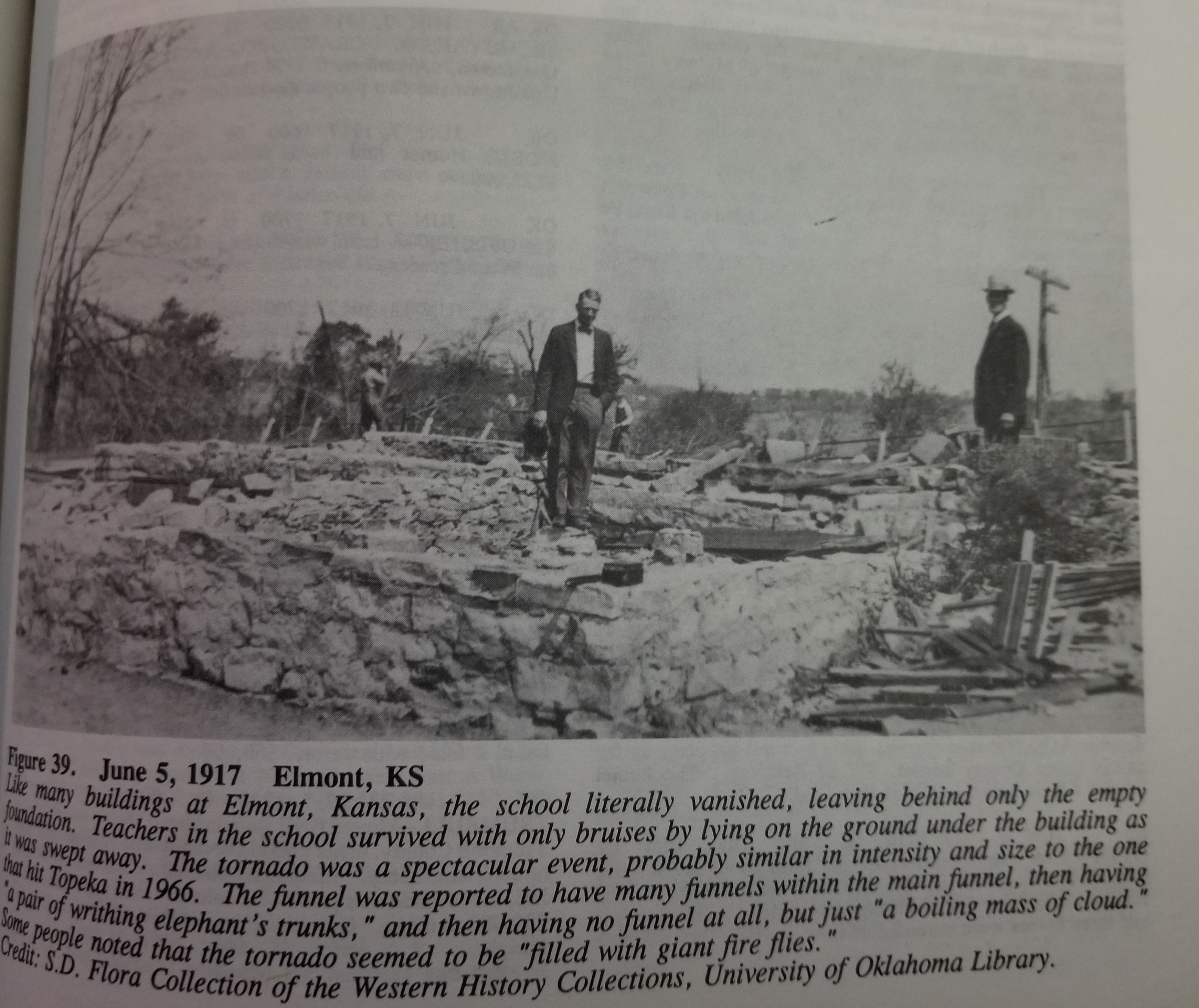- Elmont, Kansas – June 5, 1917 – Devastated the towns of Kiro and Elmont, where homes and other buildings were swept away. The school in Elmont, built of stone and mortar, simply vanished, with no debris left behind. Over rural areas, heavy farm machinery was carried great distances. This tornado passed just eight miles northwest of downtown Topeka, which was devastated by its own F5 in 1966.