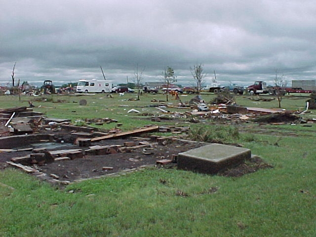- Mulhall, Oklahoma – May 3, 1999 – Mulhall was devastated by this monstrous tornado. Well-built homes were swept away and one had a portion of its foundation scoured from the ground. 60-70% of the town was severely damaged or destroyed. The local elementary school was leveled and the town’s water tower was knocked down (shades of Spencer). DOW mobile radar units measured winds in excess of 260 mph inside the funnel. Some estimates ran as high as 297 mph. At its peak, it was an incredible 2.2 miles wide, making it the largest tornado ever recorded at the time (the Hallam, NE tornado in 2004 broke that record). Scientists that were there during the outbreak said that this tornado was just as violent as the legendary Moore tornado that hit hours earlier, it just hit less. There is strong evidence supporting this tornado being an F5 and it may warrant an upgrade in the future. It, like the outbreak as a whole, has been extensively studied.