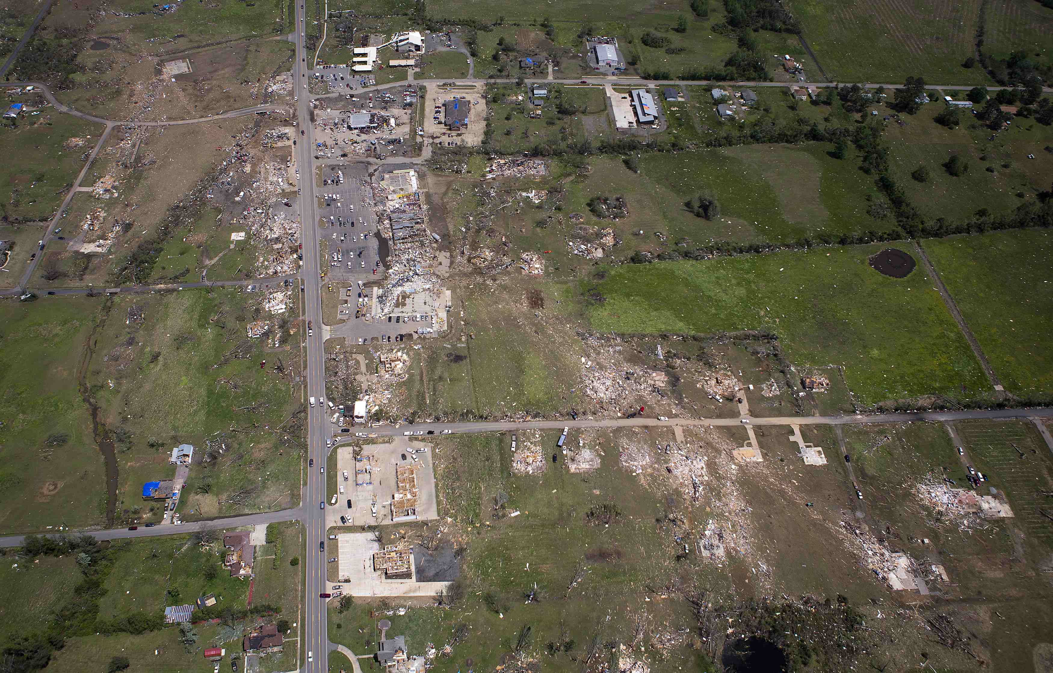 Aerial view of the devastation in the heart of Vilonia. Multiple swept away homes can be seen along Cemetery Street in the foreground.